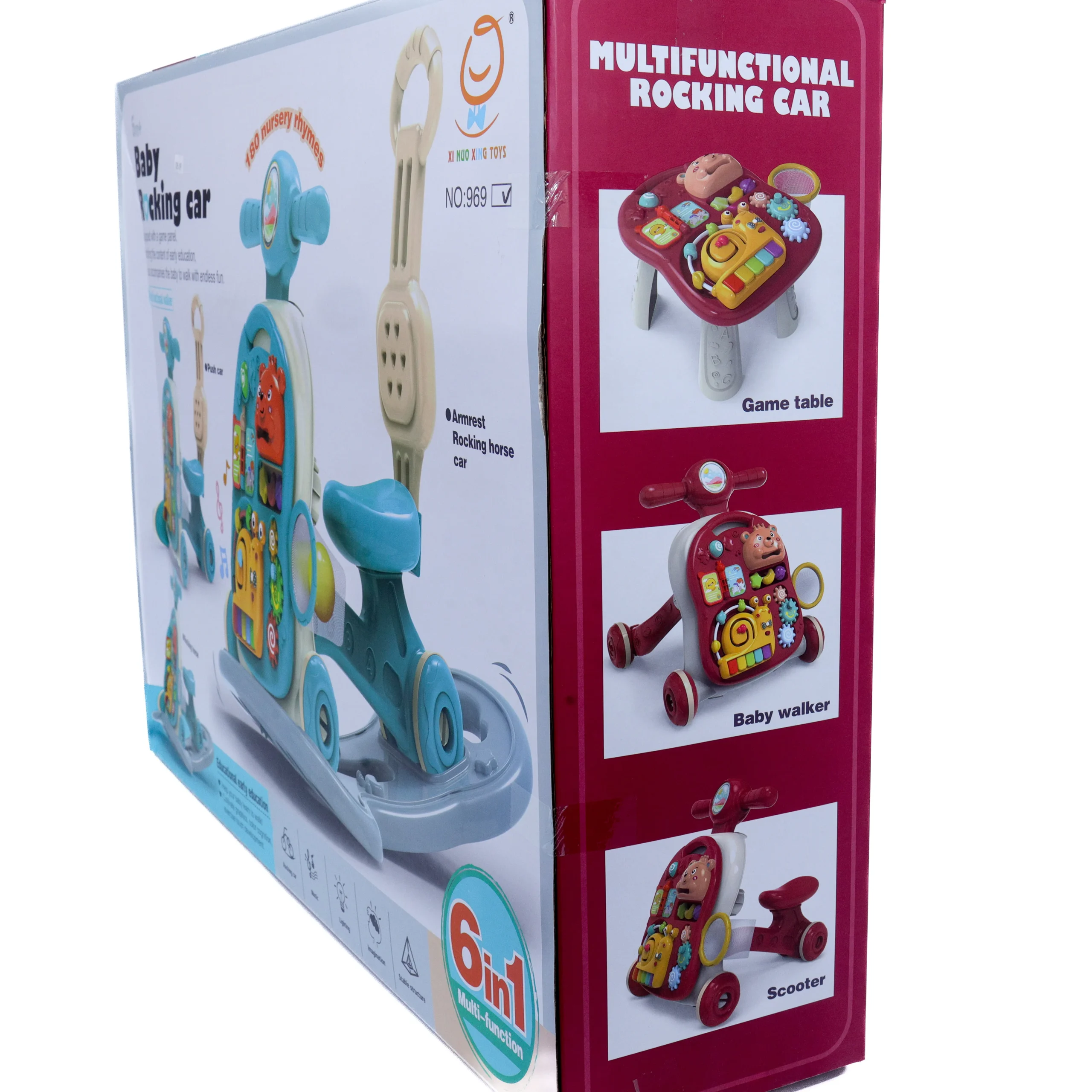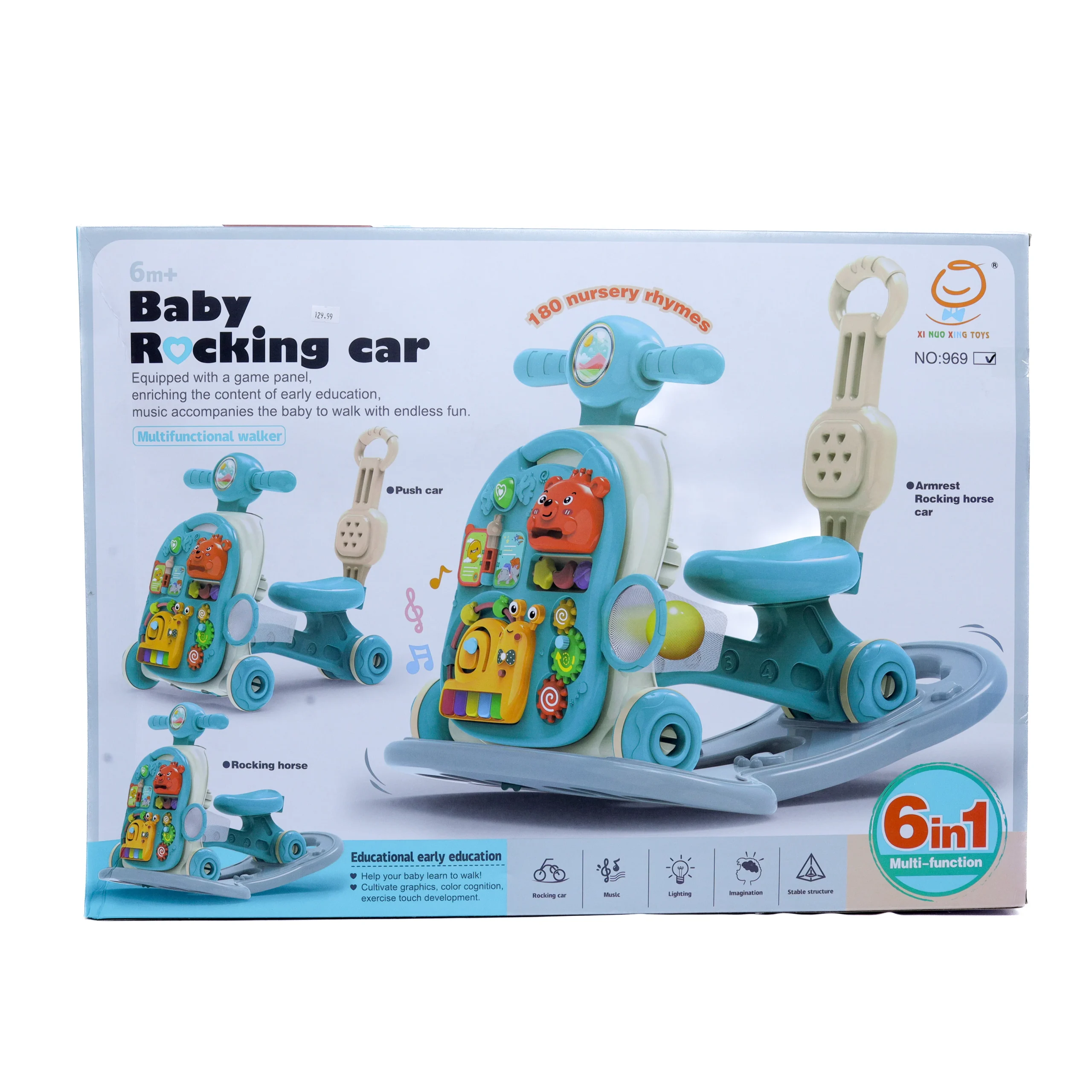 Baby rocking car walker 6-in-1 for ages 6 months+. Ride-on, rocker, and educational toy in one. Available at Twinkle Town Hamilton.