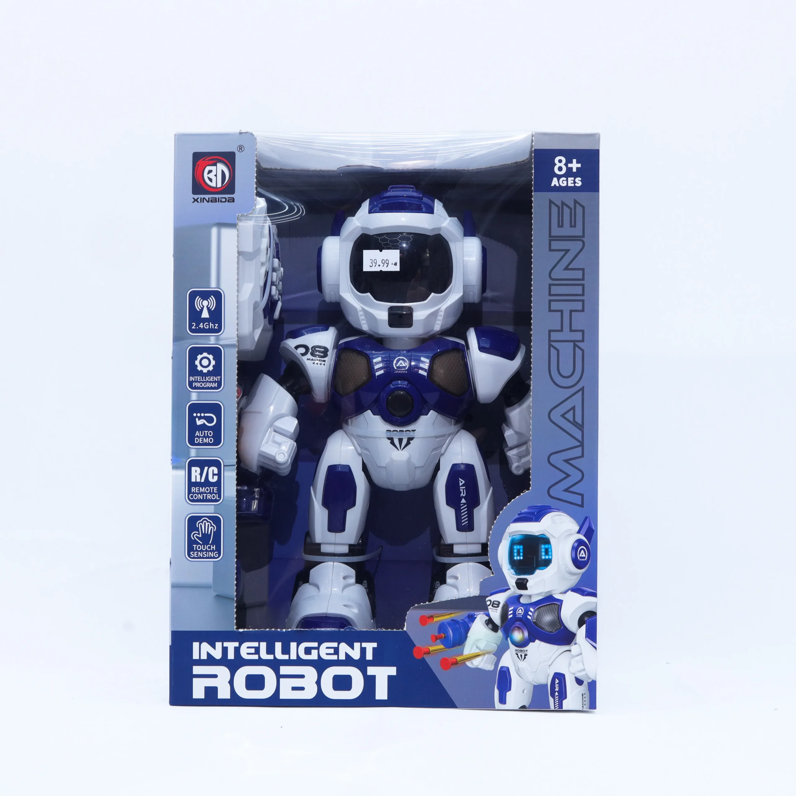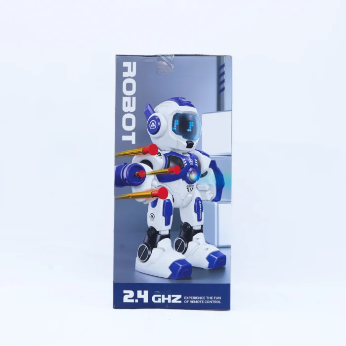 This smart robot features 2.4GHz remote control, intelligent programming, auto demo mode, shooting switch, and head touch sensing. With LED facial expressions, movement actions, sound effects, and interactive responses, it delivers a futuristic play experience.