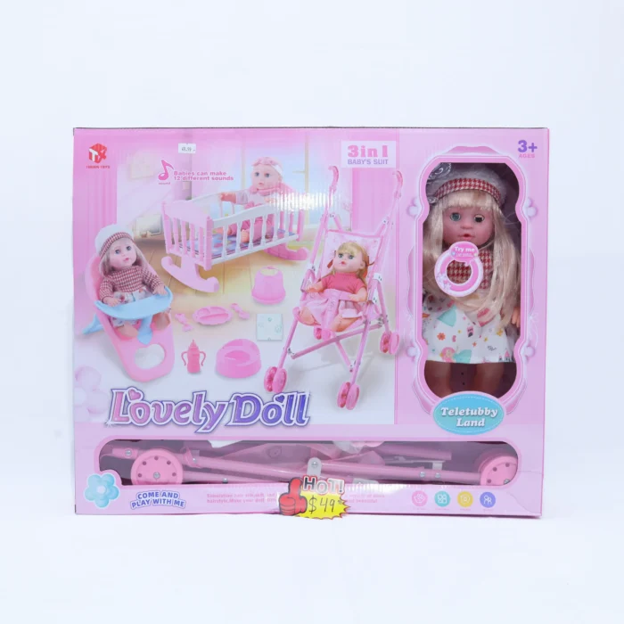 Lovely Doll 3-in-1 baby play set with stroller, crib, and feeding accessories for kids.