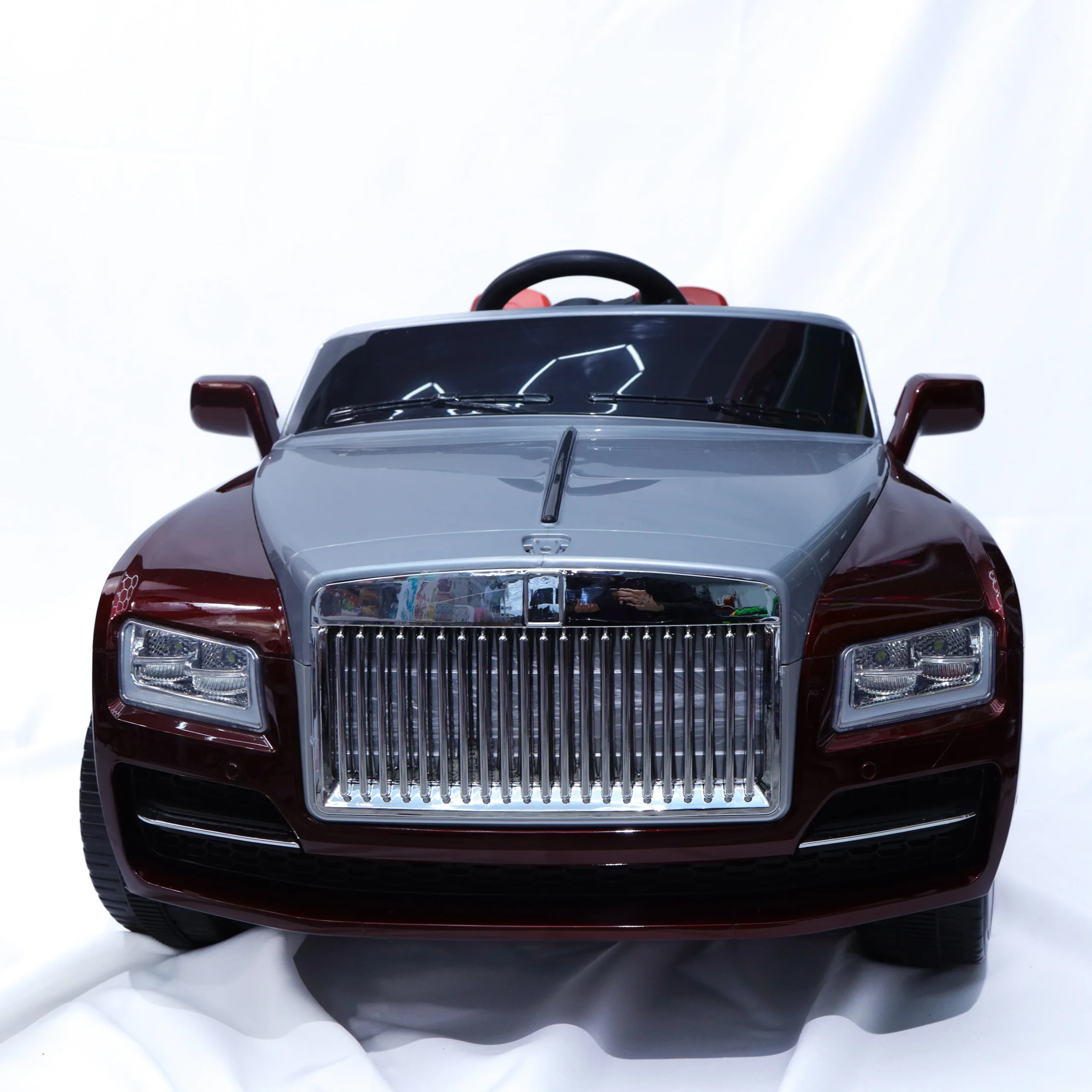 Elegant luxury-style kids ride-on car finished in a rich burgundy color with a refined silver hood and chrome-style front grille.