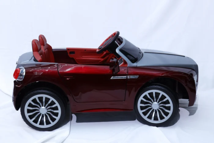 Burgundy and silver luxury electric ride-on car for kids with premium styling and comfort.