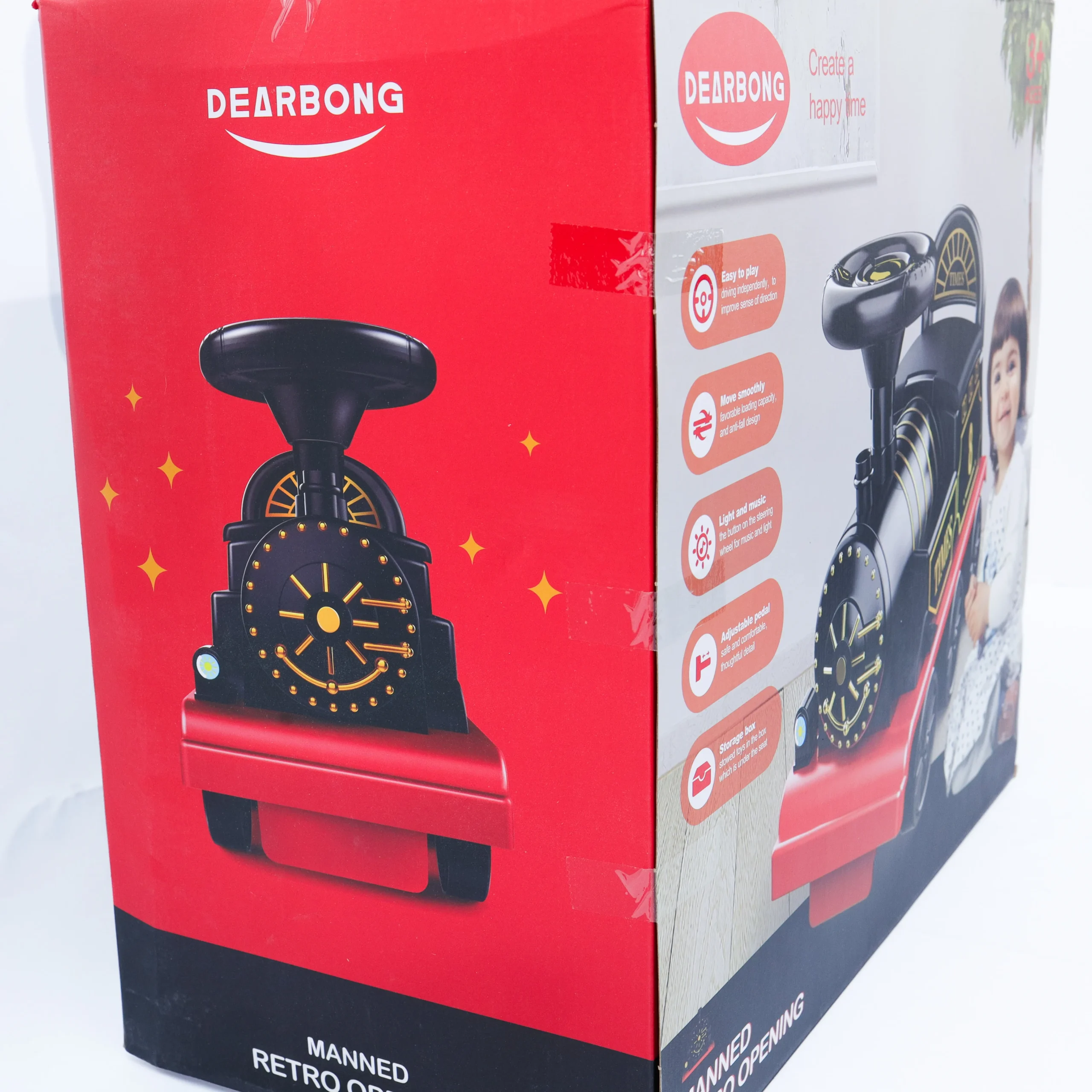 Ride-on retro train toy with music and lights for toddlers and young kids.